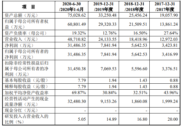 2017年度、2018年度、2019年度、2020年 1-6 月营业收入分别为 12,177.08 万元、18,030.14 万元、20,884.20 万元、49,345.34 万元。