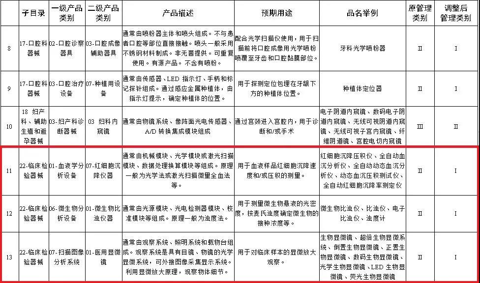 其中,临床检验器械血液学分析设备、红细胞沉降仪器、微生物分析设备、微生物比浊仪器、采样设备和器具、血液采集卡、检验及其他辅助设备等产品管理类别有所调整。