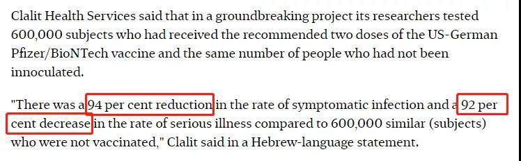 另据以色列保健维护组织(HMO)“克拉利特卫生服务学会”(Clalit Health Services)的最新报告,一项大规模的研究显示,接受两剂辉瑞/拜恩泰科(BioNTech)疫苗接种的60万人群中,新冠症状性感染率降低了94%;在同一疫苗接种群体中,因感染新冠病毒而患严重疾病的发生率也降低了92%。