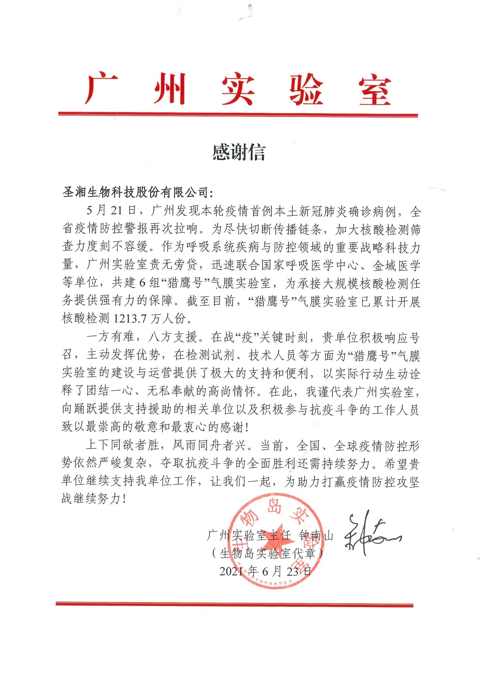 红网时刻6月28日讯(记者 刘驰锋)近日,圣湘生物收到了来自广州实验室主任钟南山院士亲笔签名的感谢信。钟南山在信中表示,圣湘生物积极参与抗疫,发挥检测试剂、技术等方面的优势,为“猎鹰号”气膜实验室的建设和运营提供了极大的支持和便利,并对此表达了最崇高的敬意和最衷心的感谢。