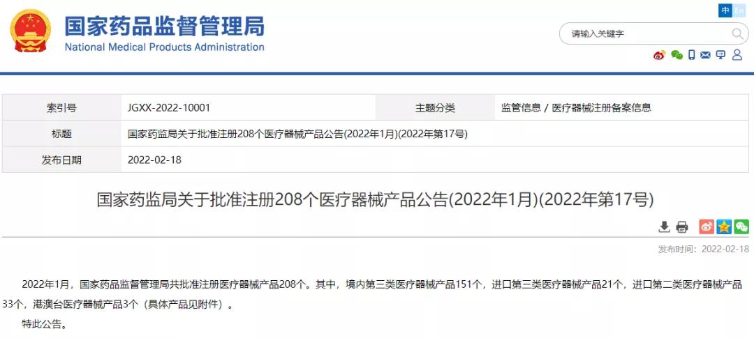 2022年1月,国家药品监督管理局共批准注册医疗器械产品208个。其中,体外诊断产品40个,境内第三类体外诊断产品31个,进口第三类体外诊断产品3个,进口第二类体外诊断产品6个。