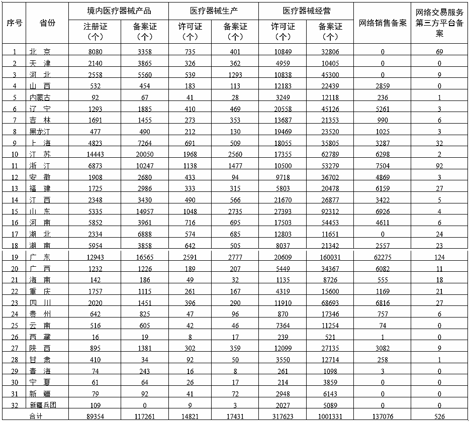 为进一步满足企业公众查询医疗器械监管信息的需要,强化社会监督与社会共治,3月8日,国家药监局发布《各省医疗器械许可备案相关信息(截至2022年2月28日)》,其汇总了各省(自治区、直辖市)有效期内医疗器械产品注册备案、医疗器械生产企业许可备案、医疗器械经营企业许可备案、医疗器械网络销售备案、医疗器械网络交易服务第三方平台备案信息(见下表)。具体数据可点击国家药监局数据查询页面医疗器械模块查询(http://app1.nmpa.gov.cn/data_nmpa/face3/dir.html?type=ylqx);如对数据有疑问,可按该网站数据库公布的纠错维护方式操作。