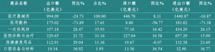 医保商会数据显示(中国海关八位码统计,部分编码涵盖非医用产品,如化工、纺织、橡胶等产品,同时未涵盖部分十位编码医药产品),2021年,我国医疗器械进出口贸易额达1440.87亿美元,同比下降16.87%,其中出口额为994.09亿美元,同比下降24.73%(详见表1)。出口额下降主要因为许多国家和地区逐步对疫情常态化应对,防疫物资相对充足,且此前疫情形势较为严重的几个国家和地区对当地防疫政策进行了调整,恐慌性采购现象有所减少。