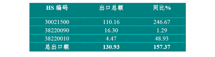 以新冠病毒检测产品为代表的体外诊断产品是全球新冠肺炎疫情蔓延以来需求持续旺盛的产品。随着国内企业对海外认证工作的重视和相关经验的积累,我国新冠病毒检测产品在国际市场的认可度和市场份额进一步提升,其出口额继续维持高速增长态势。2021年,我国主要体外诊断产品(HS编码38220010、30021500、38220090)出口额达130.93亿美元,同比增长157.37%(详见表4),新冠抗原检测(含自测)产品成为新冠病毒检测产品出口主力军。