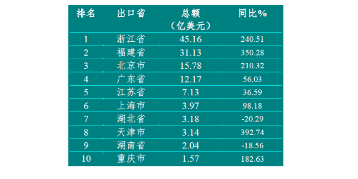 从出口发货省市来看,浙江、福建、北京体外诊断产品出口额位列前三名,分别为45.16亿美元、31.13亿美元和15.78亿美元,同比增长分别为240.51%、350.28%和210.32%。除湖北、湖南两省的出口额有明显下降,其他发货省市的出口额依然保持增长态势(详见表5)。