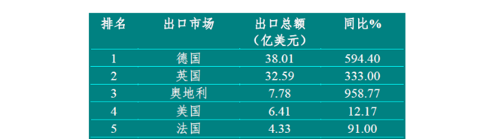 从出口市场来看,我国体外诊断产品出口目的地主要集中在欧洲,出口额排名前三位的是德国、英国、奥地利,分别为38.01亿美元、32.59亿美元和7.78亿美元,同比增长分别为594.4%,333%和958.77%(详见表6)。此外,除新冠病毒检测产品外,常规体外检测产品出口额同样继续提升。