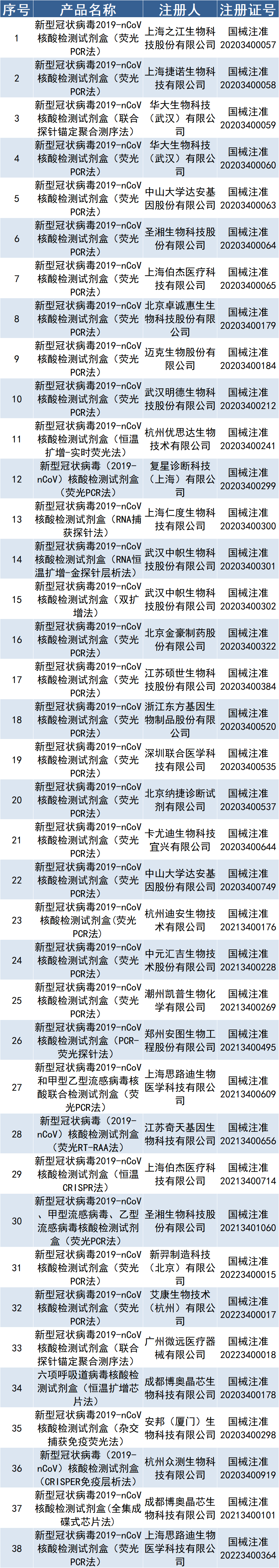 2020年1月以来,截至2022年5月6日,体外诊断行业已完成106个新型冠状病毒检测试剂盒(31个抗原检测试剂,38个核酸检测试剂,37个抗体检测试剂),12个仪器设备,2个软件,上述120个产品经国家药监局审批获准上市,助力疫情防控。