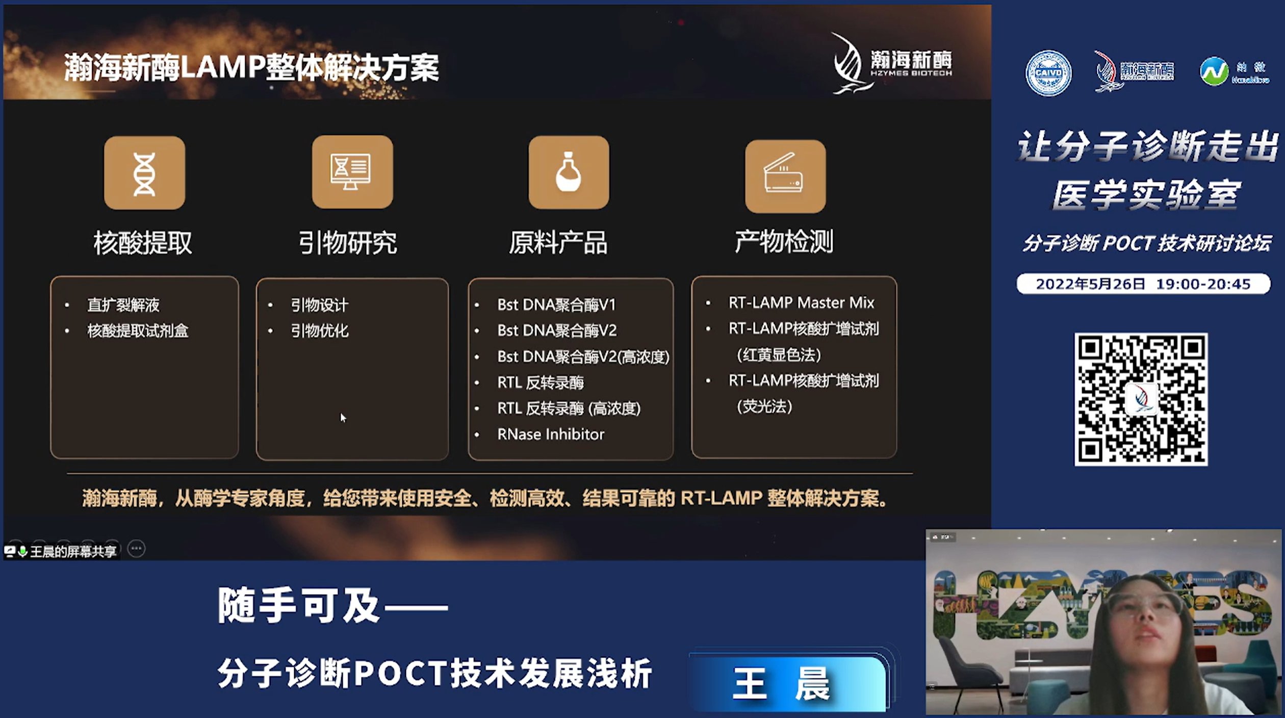 随后,瀚海新酶王晨经理为大家带来了分子诊断POCT技术分享。她从分子诊断POCT技术的基本概念开始,就该领域的市场发展趋势、技术发展路线、各技术平台的优劣势进行了详细讲解。同时就瀚海新酶LAMP等温扩增技术相关研究取得的科研成果进行了分享。王晨经理在其报告中分享了大量的开发经验与技术参数,引起行业同仁广泛认可。