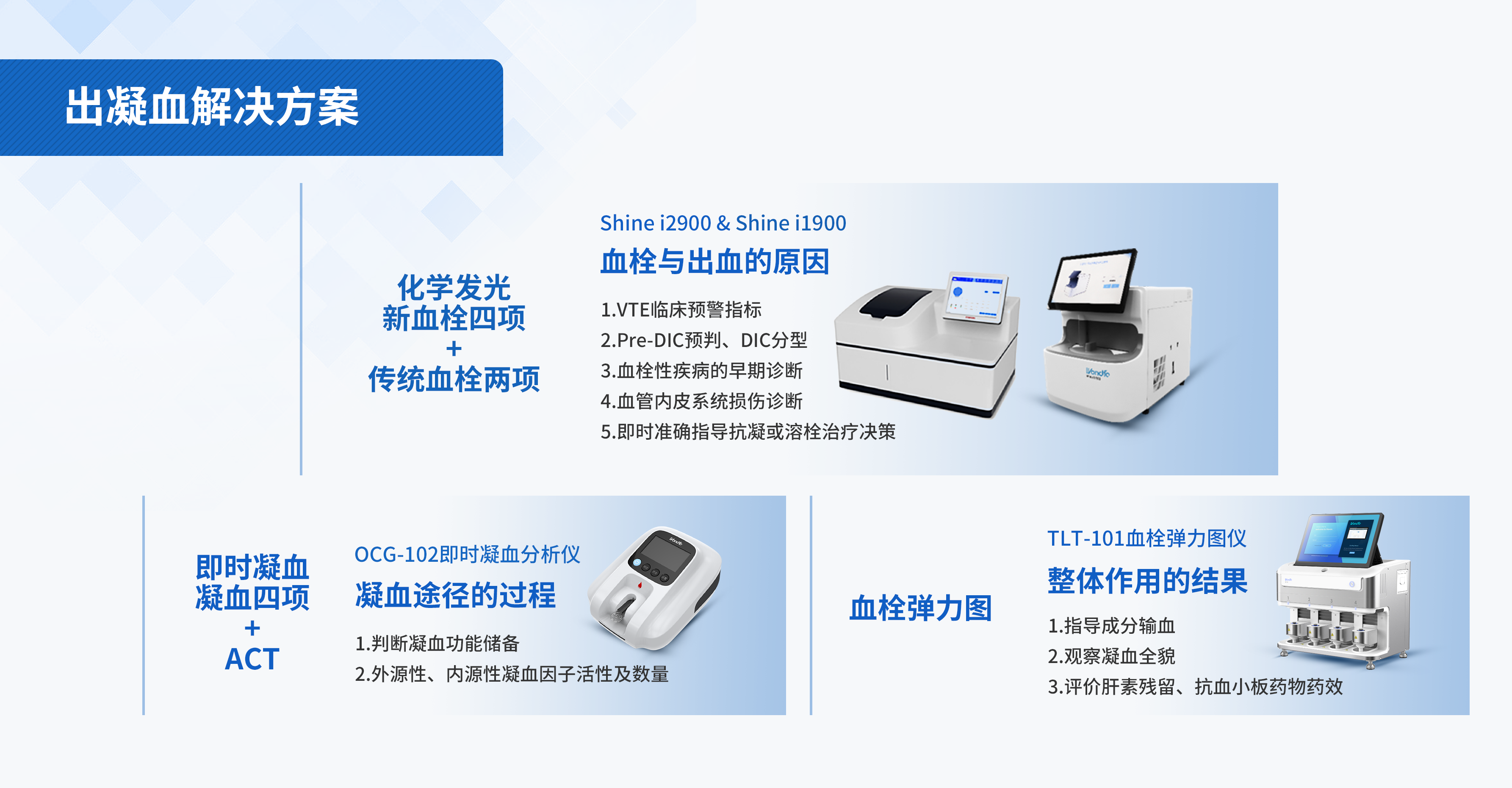 该方案覆盖关键凝血功能指标,全面检测疾病全过程,既包括传统血栓两项(D-Dimer/FDP)和化学发光新血栓四项(TAT/TM/PIC/t-PAIC),也囊括了即时凝血四项(PT/APTT/TT/FIB)、ACT及血栓弹力图(普通杯、快速杯、血小板AA、血小板-ADP、血小板AA及ADP、肝素酶杯),精准识别出凝血疾病高风险患者,能够为临床及患者提供快速、准确的检测结果,为出血及血栓性疾病的诊断与鉴别诊断、疗效与预后判断提供可靠的参考依据。