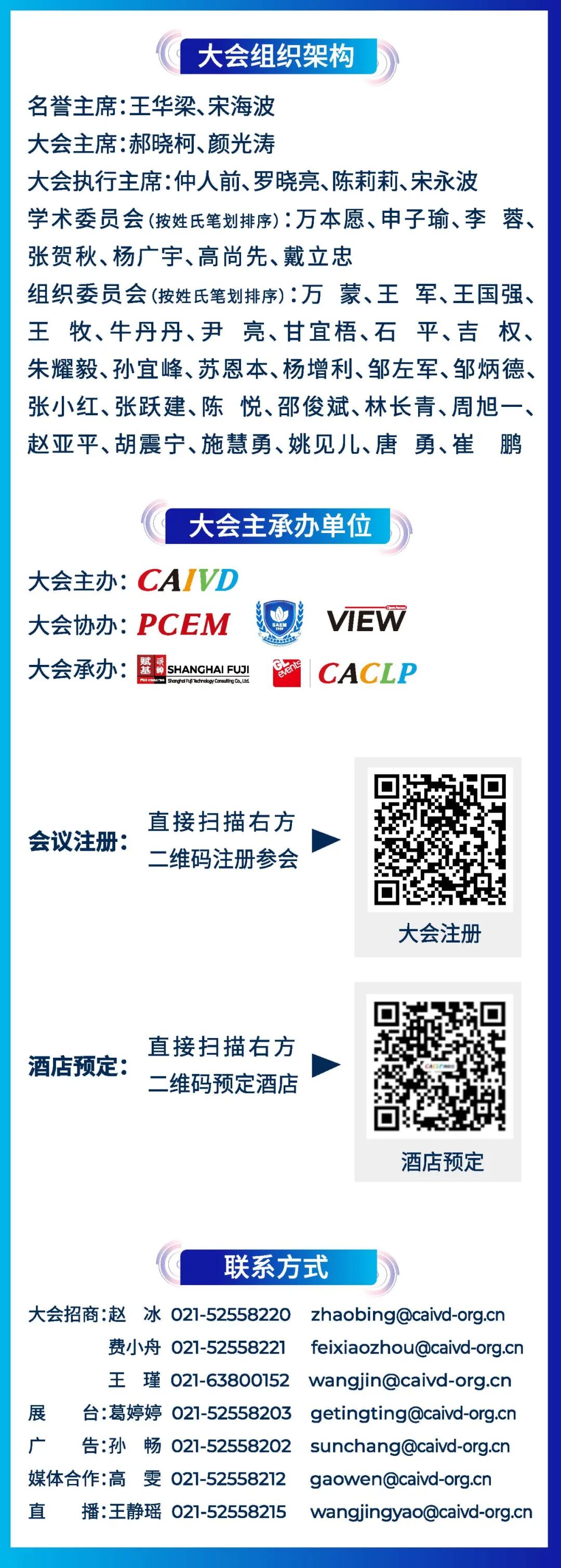 由全国卫生产业企业管理协会实验医学分会主办,全国卫生产业企业管理协会医学检验产业分会、上海市实验医学研究院、VIEW期刊协办的“‘创之声’第八届中国实验医学大会(简称“CEMC”)”,全国卫生产业企业管理协会医学检验产业分会主办的“亮· 检验—第六届体外诊断青年企业家论坛”、“第五届中国IVD流通企业论坛”、“第三届中国体外诊断关键原材料及零部件论坛”以及由智奥瑞和(上海)展览有限公司主办的第二十届中国国际检验医学暨输血仪器试剂博览会(简称“CACLP”)、第三届中国国际IVD上游原材料制造暨流通供应链博览会(简称“CISCE”)亦将同步举行。