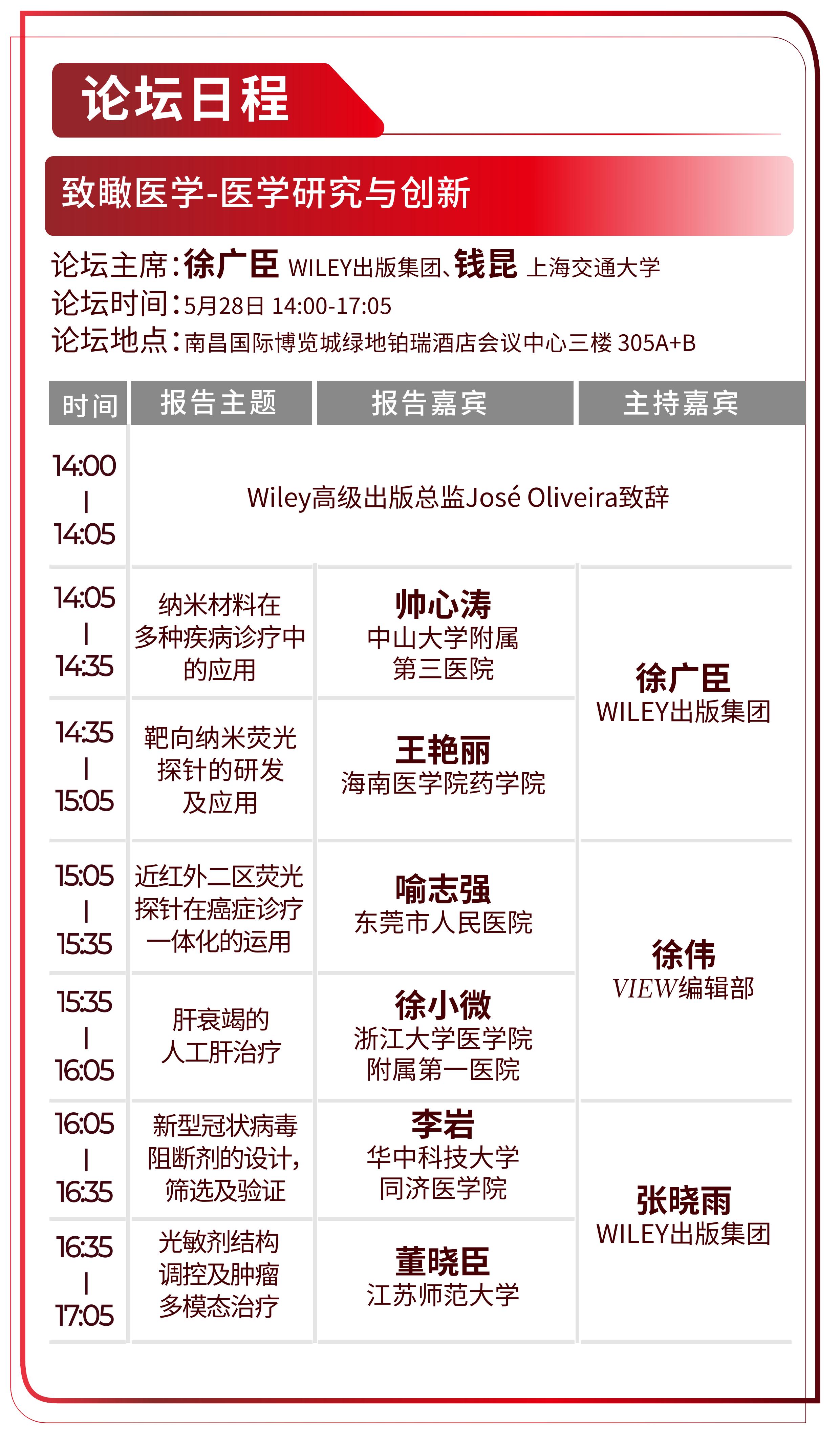 届时,“致瞰医学——医学研究与创新论坛”也将同期举行。VIEW期刊作为全国卫生产业企业管理协会实验医学分会(PCEM)与约翰威立出版有限公司(John Wiley & Sons, Inc.)共同出版的综合期刊,已被包括国际最知名的《科学引文索引》(SCI)、《工程索引》(Ei)和全球最大的引文数据库Scopus等在内的13个数据库收录,并将于今年获得首个影响因子(IF>9)。为了促进医学领域学术交流,我们即将创办一本VIEW的医学子刊(VIEW Medicine),该期刊将涵盖临床医学、基础医学、检验医学以及多学科在医学领域的最新应用。我们期待着向医学界提供最新的研究成果和应用进展,以推动医学领域的进步。