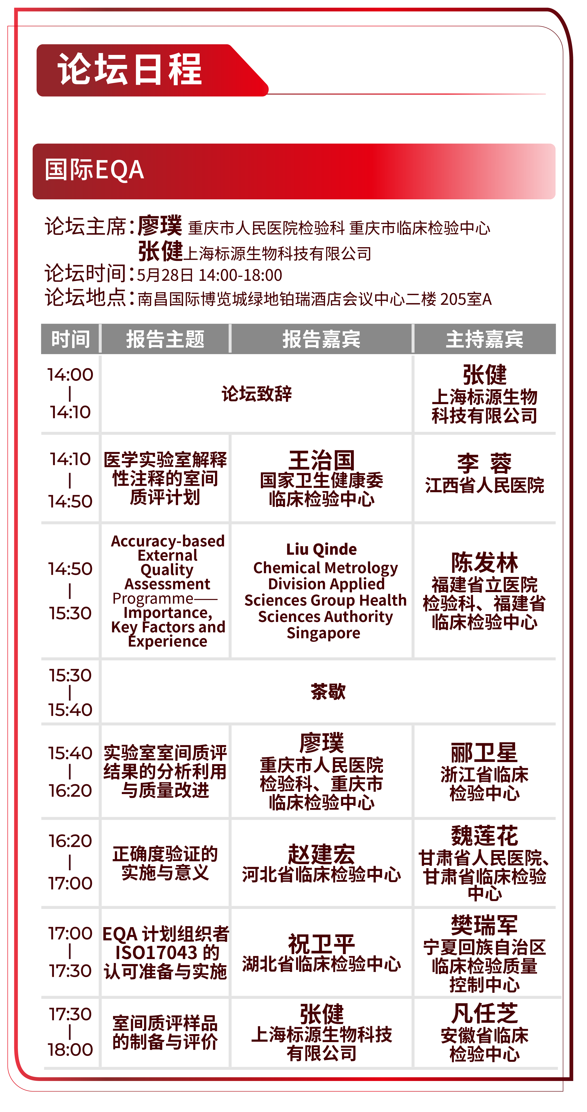届时,“国际EQA论坛”也将同期举行。医学实验室能力验证/室间质评计划(EQA)作为实验室基本质量保证工具的一个重要组成,能够证实实验室的检测能力、识别潜在的质量问题、改进分析和实验方法、支持实验室认可。本次国际EQA论坛将邀请国内外医学实验室能力验证/室间质评计划(EQA)的知名专家,带来关于国内解释性EQA计划应用现状、实验室如何通过室间质评计划改进分析质量、正确度验证的意义、能力验证提供者认可的准备与实施、室间质评样品的制备与评价等EQA的相关关键技术的宣讲和讨论,并邀请国内各省级临检中心的主任及关键技术负责人参与讨论和交流,为促进国内EQA的发展,同时为实验室的质量改进提供有益的帮助和指导。