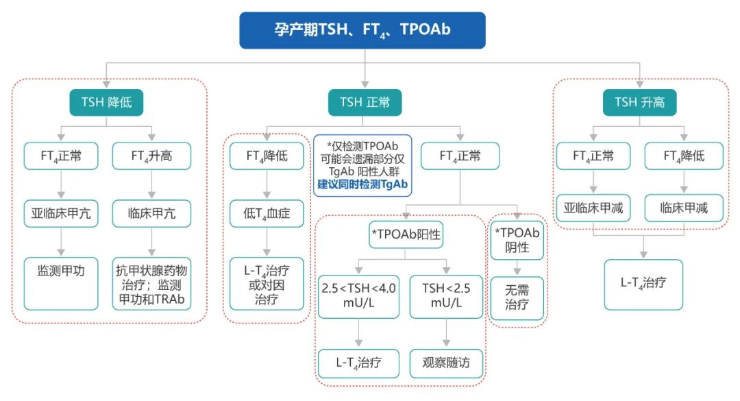 孕期筛查:《孕产期甲状腺疾病防治管理指南》所有妇女妊娠后,无论备孕期甲状腺筛查结果是否异常,均应在妊娠早期进行甲状腺疾病筛查,且血清TSH、FT4、TPOAb为首先指标。在控制性超促排卵(COH)过程中的甲状腺结果不能真实反映甲状腺功能状态,建议在可能的情况下,应在进行COH后1~2周检测甲状腺功能。对进行控制性超排卵成功受孕的女性,推荐TSH升高者进行治疗[4-5]。