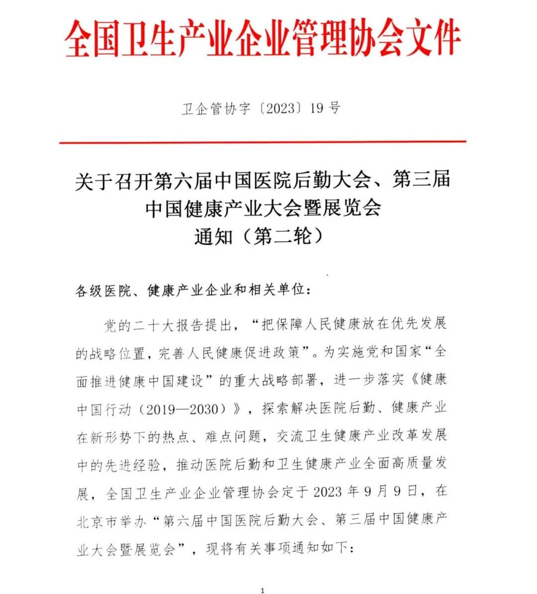 第六届中国医院后勤大会、第三届中国健康产业大会暨展览会于2023年9月9日9:00—19:00在北京召开。