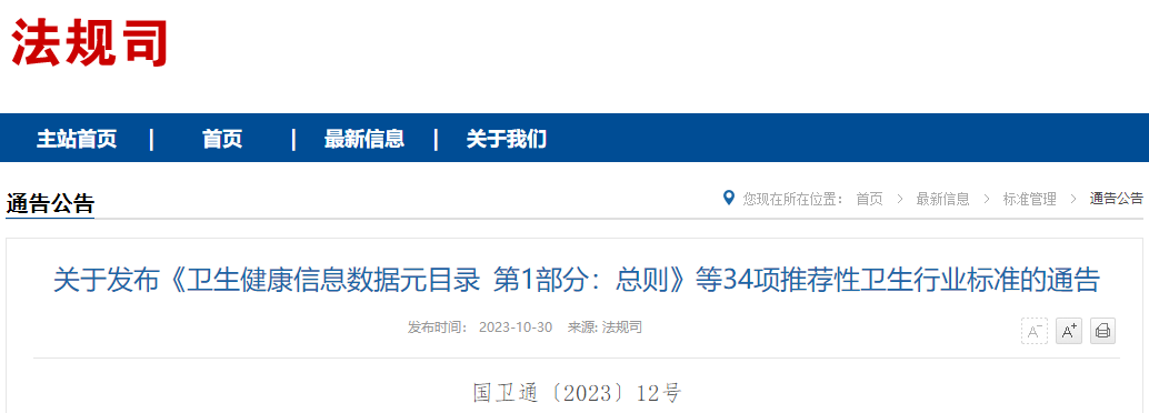 10月30日,国家卫健委发布了《卫生健康信息数据元目录 第1部分:总则》等34项推荐性卫生行业标准的通告。