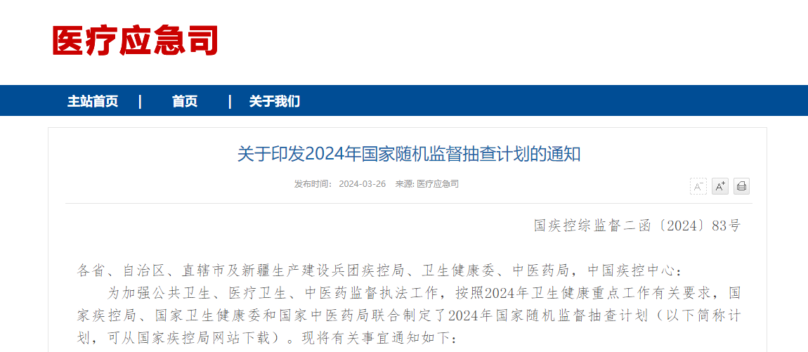 为加强公共卫生、医疗卫生、中医药监督执法工作,按照2024年卫生健康重点工作有关要求,国家疾控局、国家卫生健康委和国家中医药局联合制定了2024年国家随机监督抽查计划(以下简称计划,可从国家疾控局网站下载)。现将有关事宜通知如下: