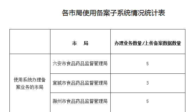 截至2016年1月11日,我省共办理第一类医疗器械备案584个,备案子系统统计数据显示:仅有六安、宣城、滁州3市局使用该系统,六安、宿州、池州等7市局向国家总局共上传了10份备案数据(具体情况见附件)。合肥、亳州、淮南、蚌埠、马鞍山、铜陵、安庆、黄山等8市局以及广德、宿松县局仍未启用备案子系统。我省使用系统和上传备案的数量均位居全国后列。请未上传数据的市局务必于2月底前上传至子系统。