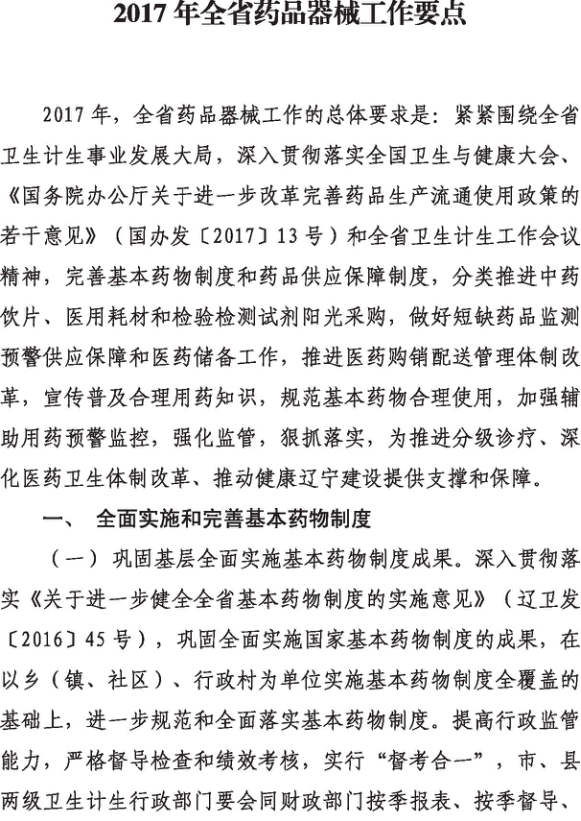 辽宁省卫生和计划生育委关于印发2017年全省药品器械工作要点的通知