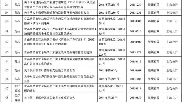 根据中共中央、国务院印发的《法治政府建设实施纲要(2015—2020年)》的要求,为做好食品药品监管法律制度“立改废释”工作,全面推进依法行政,国家食品药品监督管理总局组织对相关规范性文件进行了清理,并决定废止和宣布失效一批规范性文件。现将《国家食品药品监督管理总局第一批继续有效的规范性文件目录》(附件1)和《国家食品药品监督管理总局第一批废止和宣布失效的规范性文件目录》(附件2)予以公布。