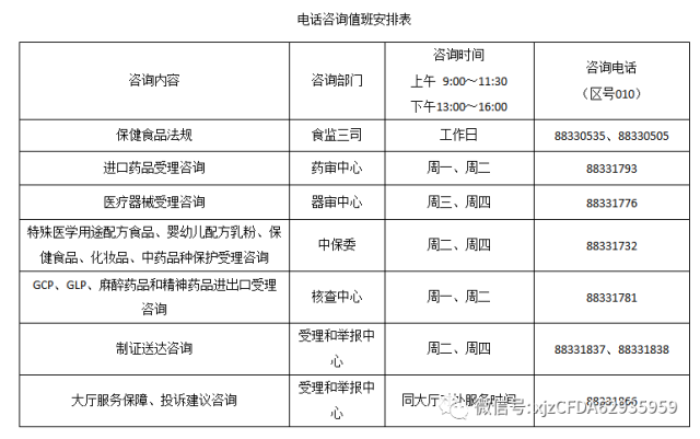 为满足行政相对人对药品、医疗器械、化妆品、保健食品、特殊医学用途配方食品、婴幼儿配方乳粉、中药保护、GCP/GLP、麻醉药品和精神药品进出口等申报事项行政受理方面的咨询需求,总局行政受理服务大厅经与相关单位协商,决定自2017年4月1日起,对大厅电话咨询及现场咨询安排进行调整。具体安排如下: