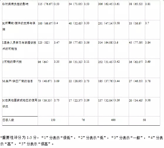医务人员所关心的各类相关信息中,甘肃兰州的被调查者选择率最高的前3项依次为“医务人员学习与掌握该技术的可能性” (80.53%)、“对病人健康的改善效果”(80.09%)、“解决未满足的医疗需要的重要性”(77.43%);上海的被调查者选择率最高的前三项依次为“对应人健康的改善效果”(77.74%)、“解决为满足的医疗需要的可能性”与“重要性”(均为74.03%)。甘肃兰州被调查者选择率最低的3项依次为“在其他国家或地区的使用状况”(33.63%)、“生产、供应厂商的信息”(42.04%)和“可能替代的技术”(59.73%);上海被调查者选择率最低的前两项与兰州相同,第3项则为“所需软/硬件的支持与保障”(48.98%)。而对各类信息的重要性评价中,得分最高的前3项,甘肃兰州的被调查者依次为“对病人健康的改善效果”(3.66)、“解决未满足的医疗需要的重要性” (3.63)、“解决未满足的医疗需要的可能性” (3.61);上海的被调查者依次为, “对病人健康的改善效果”(3.83)、“对已有诊疗模式/技术的影响”(3.66)和“解决未满足的医疗需要的重要性”(3.65);得分最低的前三项,甘肃兰州的被调查者依次为“在其他国家或地区的使用情况”(2.64)、“生产/供应厂商的信息” (3.01)、“可替代的技术” (3.29);上海的被调查者依次为,“在其他国家或地区的使用状况”(3.27)、“可能涉及的病人规模”(3.44)和“可能的替代技术”(3.45)。见表3。