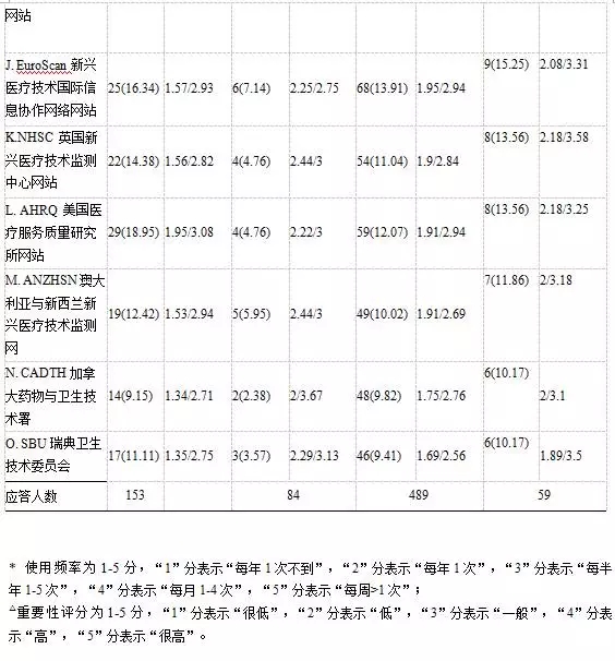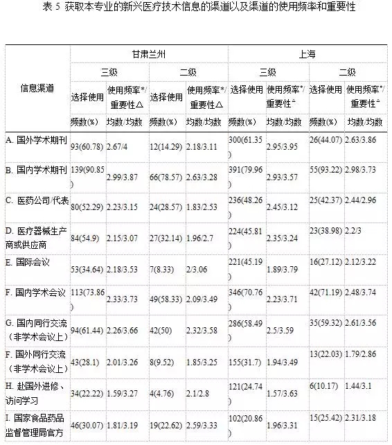 结果显示,获取新兴医疗技术相关信息的各类渠道中,选择率最高的前3项中,甘肃兰州依次为“国内学术期刊”(86.50%)、“国内学术会议”(68.35%)和“国内同行交流(非学术会议上)” (58.23%),而上海在前两项上与兰州同,第三大渠道则是“国外学术期刊”(59.49%)。在对信息渠道使用频率与重要性的评价上,兰州的被调查者同样对前3项的渠道使用频率最高,而上海的被调查者使用频率最高的3项依次为“国内学术期刊”(2.94)、“国外学术期刊”(2.92)与“国内同行交流(非学术会议上)”(2.51),但两地调查者均认为“国外学术期刊”的重要性最高。调查中,我们也发现,医药公司和医疗器械生产或供应商,也是医务人员新兴医疗技术信息的重要信息来源,使用频率与重要性都不低。见表4。
