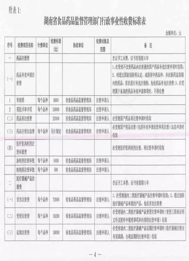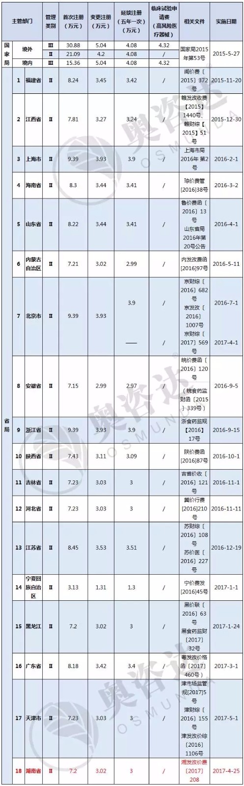 近日湖南省药监局转发了湖南省发改委和财政厅关于重新发布食品药品监督管理部门行政事业性收费标准的暂行通知(湘发改价费〔2017〕208号),湖南省医疗器械产品注册也开始收费了,而且该省还是首个可以走“加急通道”的省份!这也是继福建、江西、上海、海南、山东、内蒙古、北京、安徽、浙江、陕西、吉林、河北、江苏、宁夏、天津、黑龙江、广东之后的第18个医疗器械注册收费地区。以下为湖南省第二类医疗器械产品注册收费标准: