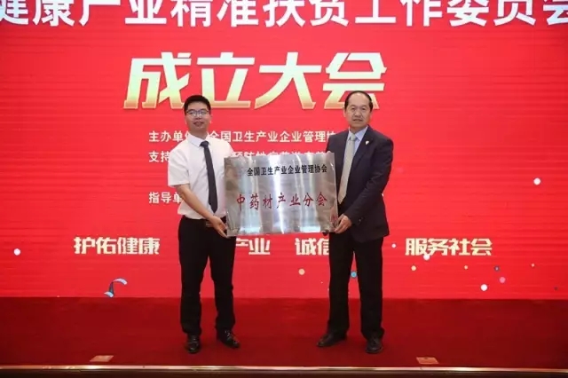 2017年5月23日,全国卫生产业企业管理协会中药材产业分会和健康产业精准扶贫工作委员会成立大会在北京举行。来自中央、国家机关和部队有关领导与全国各地的中医药健康产业及扶贫工作领域的专家、学者和企业家们参加了会议。出席会议并致辞的领导有: