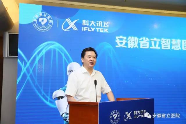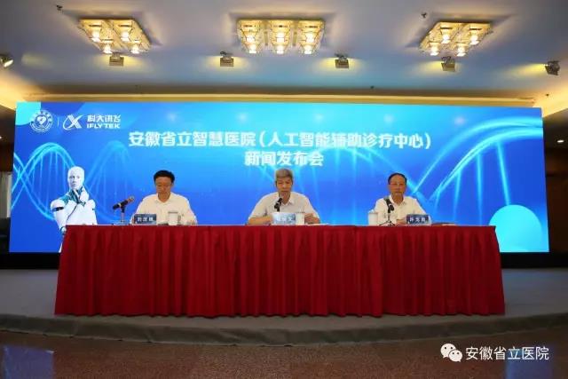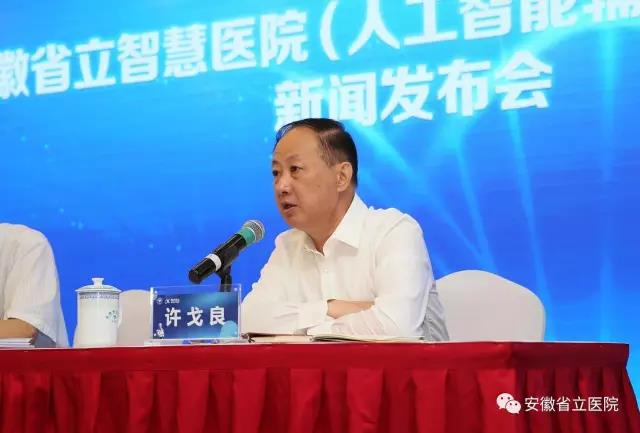 在揭牌仪式前举行的新闻发布会上,省立医院院长许戈良与科大讯飞股份有限公司董事长刘庆峰分别就安徽省立智慧医院(人工智能辅助诊疗中心)建设和人工智能诊疗平台建设应用进行新闻发布,并答记者问。