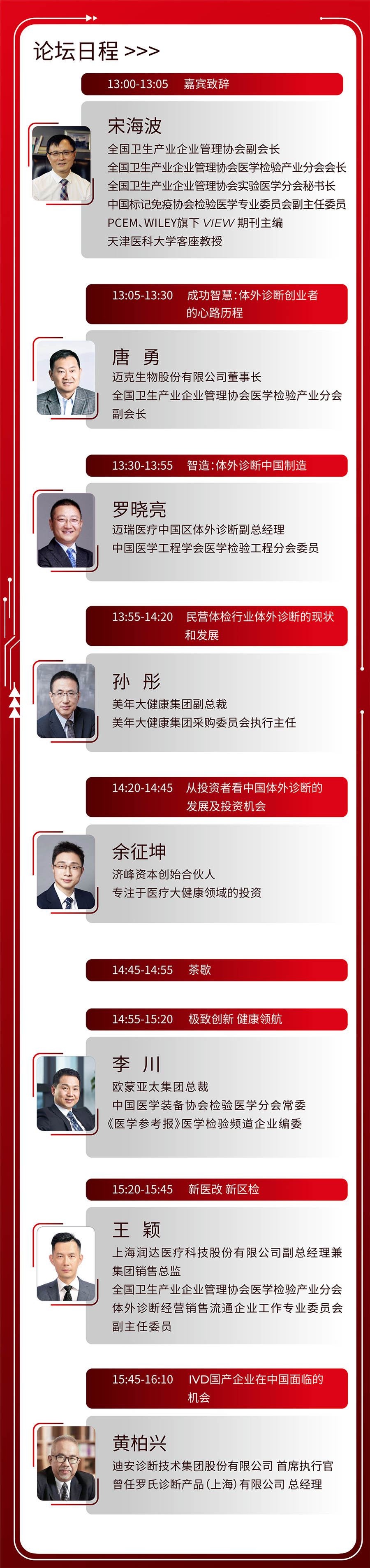 本次论坛邀请了体外诊断知名上市企业董事长、高管、资深投行经理围绕IVD企业创新与发展、中国制造、行业整合、医改政策等话题展开讨论,并联手CIIDC、CEMC、CACLP为您呈现一场前所未有的集学术与视觉,信息与合作,转化与服务,宣传与文化为一体的论坛,共同推进体外诊断行业创新的新进程。