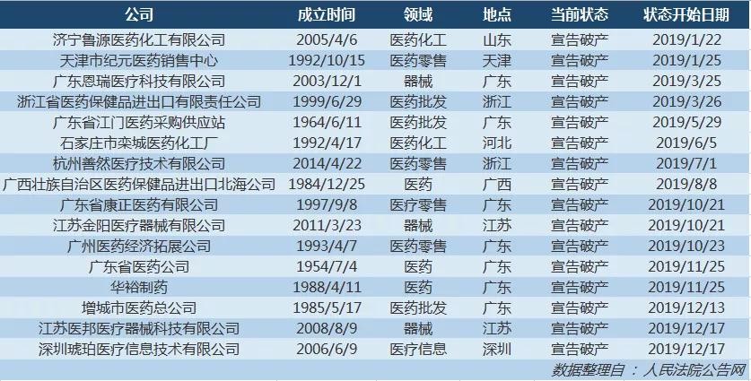在时代数据公布的19家倒闭的医健创业企业之外,我们在人民法院公告网破产文书一栏,分别搜索医药和医疗两个关键词,汇总、整理发现2019年医疗健康领域宣告破产的企业有16家,此外还有22家企业处于破产申请状态,具体情况如下: