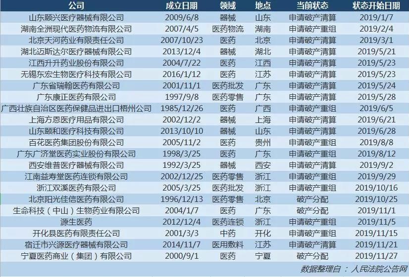 2019年22家医健企业处于破产申请状态(不完全统计)