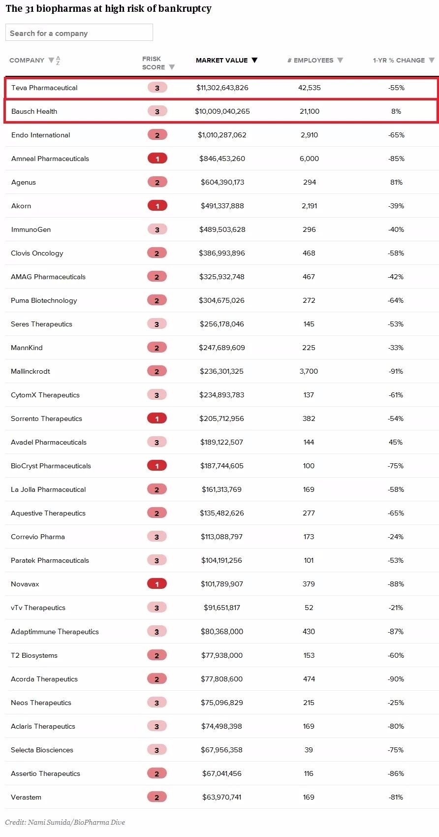 商业诉讼、巨额债务、法律责任、市场压力......系列因素将那些面临着巨大风险的企业推向悬崖。生物制药行业网站BioPharma Dive此前发布的一项分析指出,有31家陷入困境的生物制药公司在未来12个月内破产的风险最高,这其中有小型创业公司,也包括梯瓦制药(Teva Pharmaceutical)和博士康(Bausch Health)这样的大型制药商。