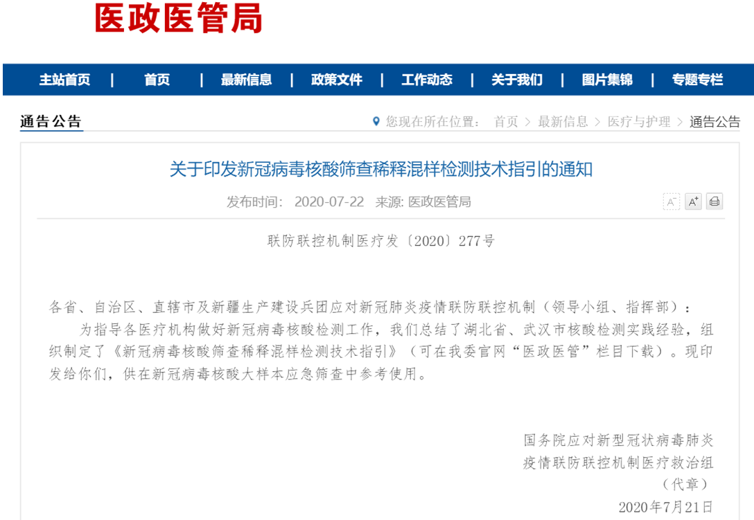 2020年7月21日,国务院应对新型冠状病毒肺炎疫情联防联控机制医疗救治组印发了《新冠病毒核酸筛查稀释混样检测技术指引》(简称技术指引)。该技术指引为各医疗机构做好新冠病毒核酸检测工作提供了指导,旨在指导临床更好地应对大规模人群筛查工作。