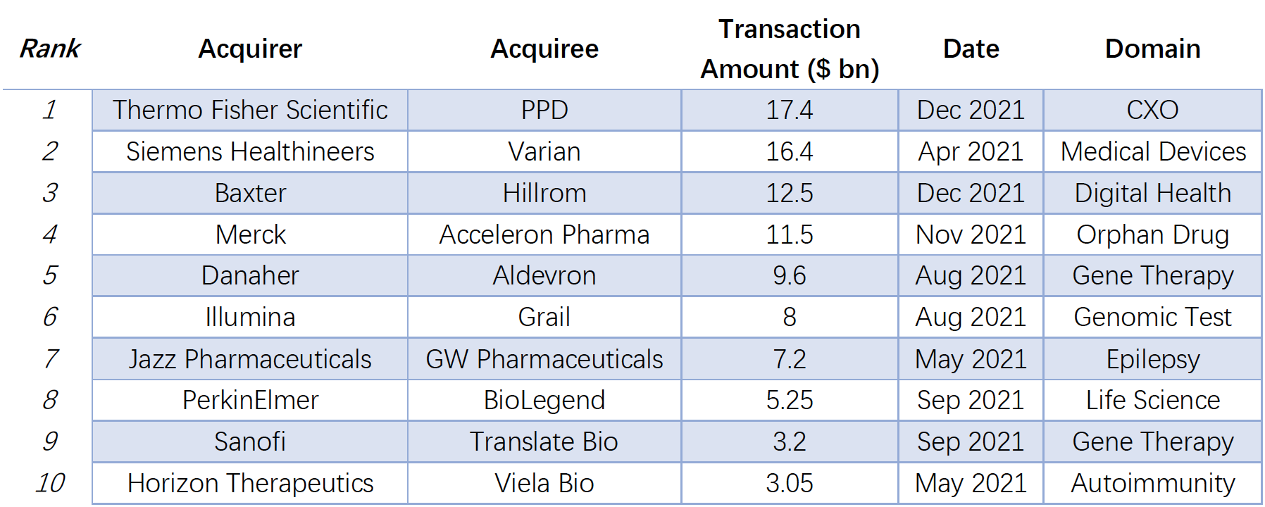 2022/1/13 12:58:13 Views£º1211In 2021, global M&A transactions in the biomedical field will basically return to pre-pandemic levels. Enterprises are actively developing in cutting-edge fields such as CXO, digital health, gene therapy, precision medicine etc. According to public statistics, the transaction value of the global TOP10 healthcare M&A deals in 2021 will all be more than $3 billion, of which Thermo Fisher¡¯s acquisition of PPD for $17.4 billion ranks first. In addition, due to AstraZeneca¡¯s block, Advent Capital and Aurora¡¯s $8.1 billion acquisition of Sobi failed, so it was not included in the calculation.