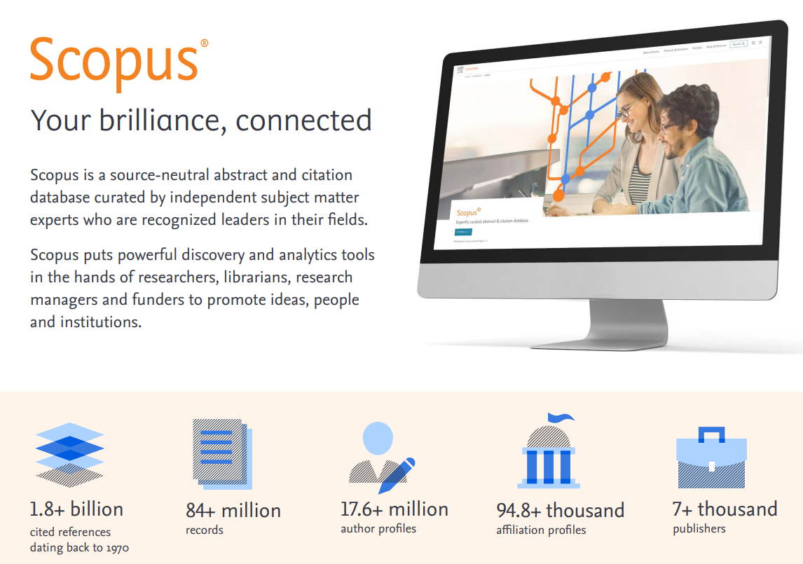 Scopus uniquely combines a comprehensive, expertly curated abstract and citation database with enriched data and linked scholarly literature across a wide variety of disciplines. Scopus quickly finds relevant and authoritative research, identifies experts and provides access to reliable data, metrics and analytical tools. Be confident in progressing research, teaching or research direction and priorities ¡ª all from one database and with one subscription.