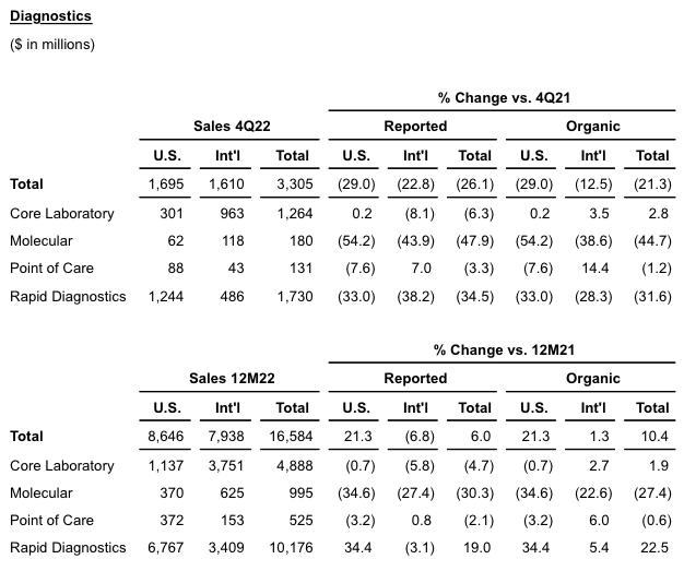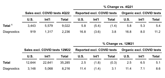 Note: Management believes that measuring sales growth rates on an organic basis is an appropriate way for investors to best understand the underlying performance of the business. Organic sales growth excludes the impact of foreign exchange. In order to compute results excluding the impact of exchange rates, current year U.S. dollar sales are multiplied or divided, as appropriate, by the current year average foreign exchange rates and then those amounts are multiplied or divided, as appropriate, by the prior year average foreign exchange rates. Management further believes that measuring sales growth rates on an organic basis excluding COVID-19 tests is an appropriate way for investors to best understand the underlying performance of the business in the fourth quarter ended Dec. 31, 2022 as well as in 2023 as the COVID-19 pandemic shifts to an endemic state, resulting in significantly lower expected demand for COVID-19 tests.