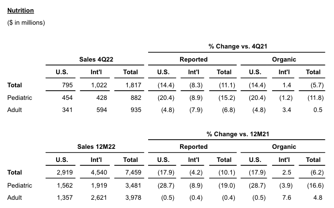 Worldwide Nutrition sales decreased 11.1 percent on a reported basis and 5.7 percent on an organic basis in the fourth quarter. Total worldwide Nutrition and Pediatric Nutrition sales were negatively impacted as a result of manufacturing disruptions during 2022 of certain infant formula products3 at Abbott's Sturgis, Michigan, facility. The manufacturing facility has subsequently restarted production.