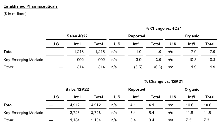 Established Pharmaceuticals sales increased 1.0 percent on a reported basis and 7.9 percent on an organic basis in the fourth quarter.