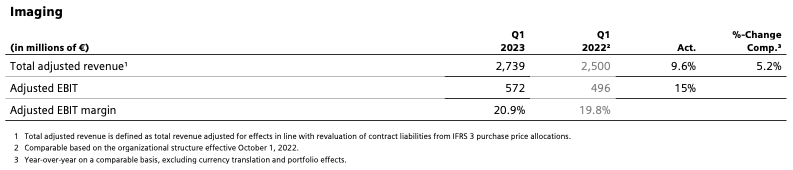 - Imaging showed solid comparable revenue growth of 5.2% and a clear improvement in adjusted EBIT margin of 100 basis points year-over-year to 20.9%