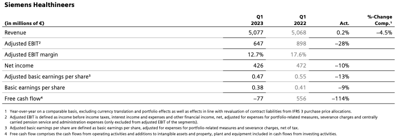 Revenue in the first quarter of fiscal year 2023 declined on a comparable basis by 4.5%. The primary reason is markedly lower revenue from rapid COVID-19 antigen tests. Excluding the antigen tests, revenue rose on a comparable basis by 0.7%. The Imaging and Advanced Therapies segments achieved solid growth. On the downside were a pandemic-related fall in Diagnostics revenue in China and supply-chain delays due to a problem at a Varian supplier, which has since been resolved.