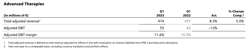 - Advanced Therapies comparable revenue growth at a solid 5.0% and adjusted EBIT margin of 11.6%