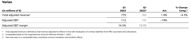 The Varian segment posted revenue of €770 million in the first quarter, representing a decline of 4.5% on a comparable basis. Supply-chain delays due to a problem at a supplier, which has since been resolved, led to revenue being pushed out into the next quarters, especially in the Asia Pacific Japan and China regions. In the EMEA and Americas regions, revenue was on the prior-year levels.