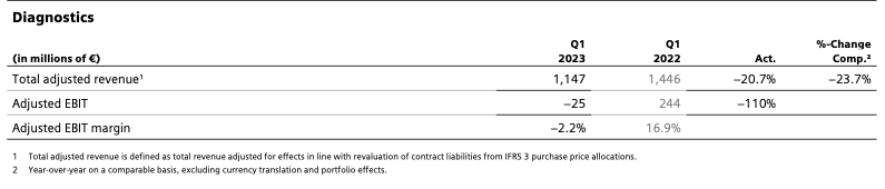 - Diagnostics revenue down 23.7% on a comparable basis, mainly due to a markedly lower contribution from rapid COVID-19 antigen tests and the COVID-19 situation in China; adjusted EBIT margin slightly negative at -2.2% due to transformation costs
