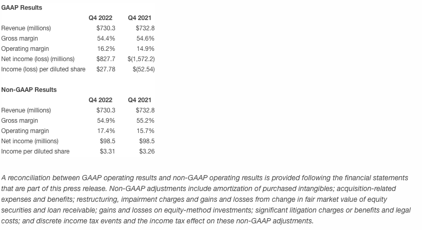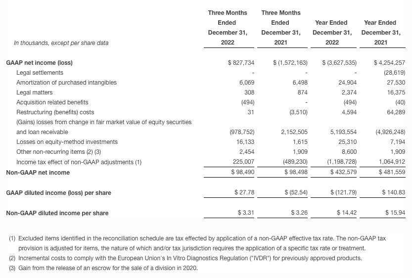 Net income for the fourth quarter of 2022 was $827.7 million, or $27.78 per share, on a diluted basis, versus a net loss of $1,572.2 million, or $52.54 per share, on a diluted basis, during the same period in 2021. Net income (loss) amounts for the fourth quarter of 2022 and 2021 were predominantly impacted by the recognition of changes in the fair market value of equity securities related to the holdings of the company¡¯s investment in Sartorius AG.