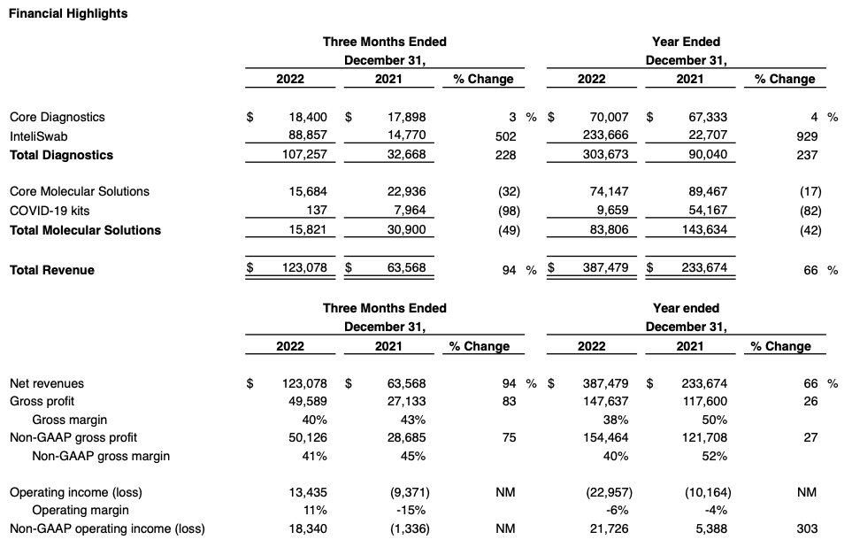 - InteliSwab® revenue of $88.9 million in Q4, up 12% sequentially; wins two new federal government contracts extending the tail on InteliSwab® revenue