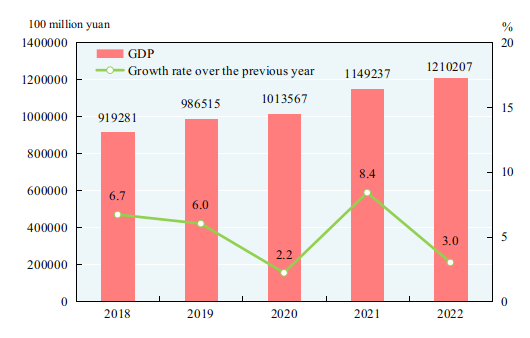 According to preliminary estimation, the gross domestic product (GDP)[2] in 2022 was 121,020.7 billion yuan, up by 3.0 percent over the previous year. Of this total, the value added of the primary industry was 8,834.5 billion yuan, up by 4.1 percent over the previous year, that of the secondary industry was 48,316.4 billion yuan, up by 3.8 percent and that of the tertiary industry was 63,869.8 billion yuan, up by 2.3 percent. The value added of the primary industry accounted for 7.3 percent of the GDP; that of the secondary industry accounted for 39.9 percent; and that of the tertiary industry accounted for 52.8 percent. The contribution of the final consumption expenditure to GDP growth rate was up by 1.0 percentage point, that of the gross capital formation to GDP growth rate up by 1.5 percentage points and that of the net exports of goods and services to GDP growth rate up by 0.5 percentage points. The per capita GDP in 2022 was 85,698 yuan, up by 3.0 percent over the previous year. The gross national income[3] in 2022 was 119,721.5 billion yuan, up by 2.8 percent over the previous year.