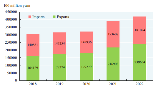 The total value of imports and exports of goods in 2022 reached 42,067.8 billion yuan, up by 7.7 percent over that of the previous year. Of this total, the value of goods exported was 23,965.4 billion yuan, up by 10.5 percent; the value of goods imported was 18,102.4 billion yuan, up by 4.3 percent. The surplus of trade in goods reached 5,863.0 billion yuan, up by 1,533.0 billion yuan over that of the previous year. The total value of imports and exports between China and countries along the Belt and Road[40] was 13,833.9 billion yuan, an increase of 19.4 percent over that of the previous year. Of this total, the value of goods exported was 7,887.7 billion yuan, up by 20.0 percent; the value of goods imported was 5,946.1 billion yuan, up by 18.7 percent. The total value of imports and exports between China and other Regional Comprehensive Economic Partnership (RCEP) member countries[41] was 12,949.9 billion yuan, up by 7.5 percent over that of the previous year.