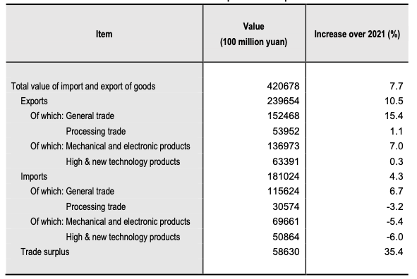Table 9: Total Value and Growth Rates of Imports and Exports of Goods in 2022