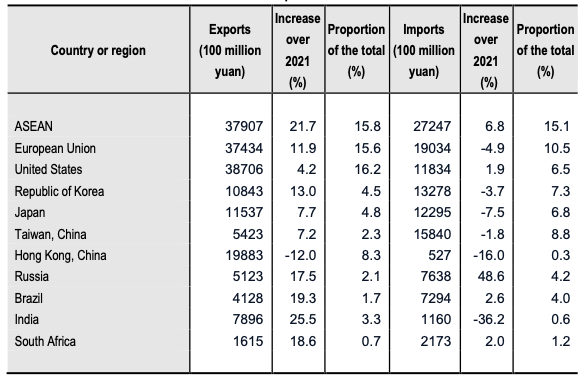 Table 12: Imports and Exports of Goods by Major Countries and Regions, the Growth Rates and Proportions in 2022